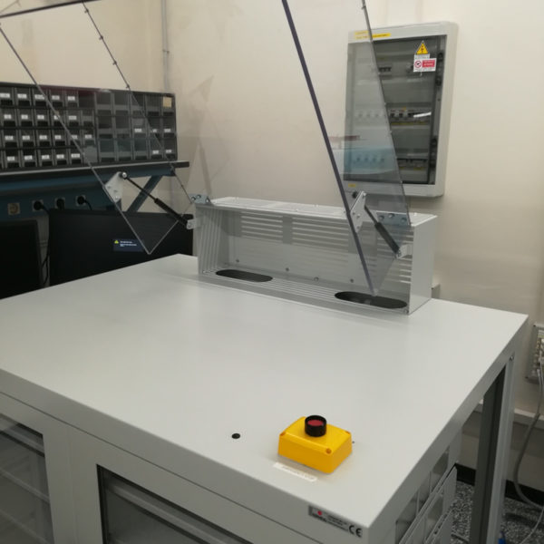 Piano di appoggio apparati Elettronici con protezione in Policarbonato assistito da pistoncini pneumatici.